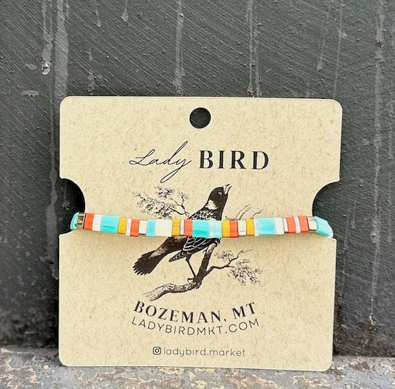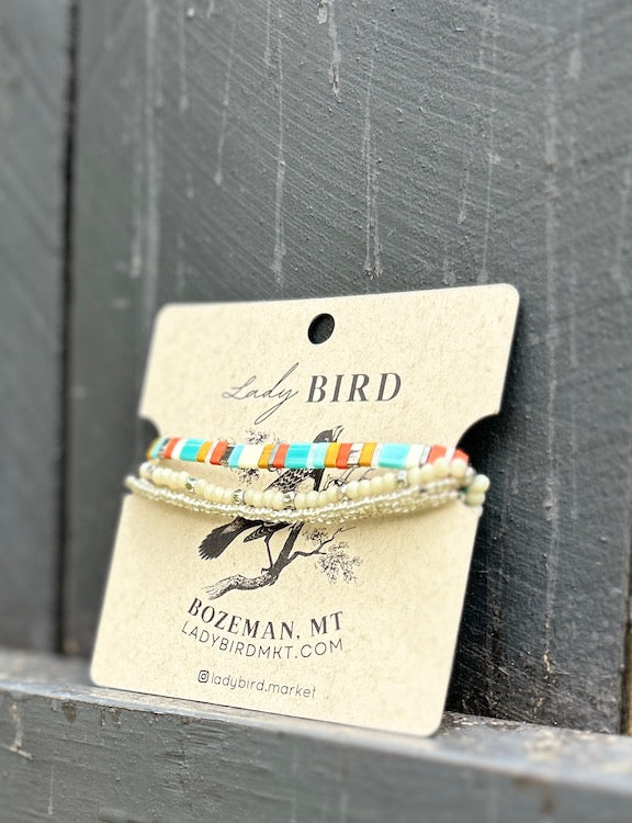 Featuring a throwback retro-style color combo, turquoise blue with orange, yellow, and silver or gold stripes (depending on your preference) coupled with a white beaded wrap in silver or gold, these stacked wrap bracelets are classy yet playful. As two separate pieces for a stacked bracelet look, the Tila bracelet and wrap bracelet can be worn on their own, but they're even better together! Or EVEN better, pair them with matching tile-beaded dangle earrings and one of our seed bead wrap bracelets for the win!