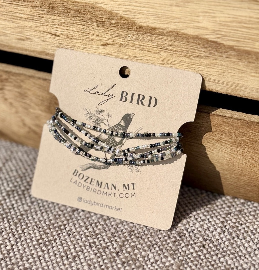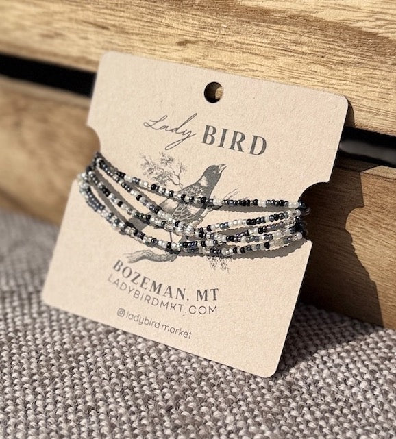 Add a touch of boho-chic shimmer to your look with this versatile wrap bracelet and necklace from Lady Bird. Handcrafted with a mix of black, white, and silver Czech glass seed beads with metallic silver beads, each piece is designed to stand out.
