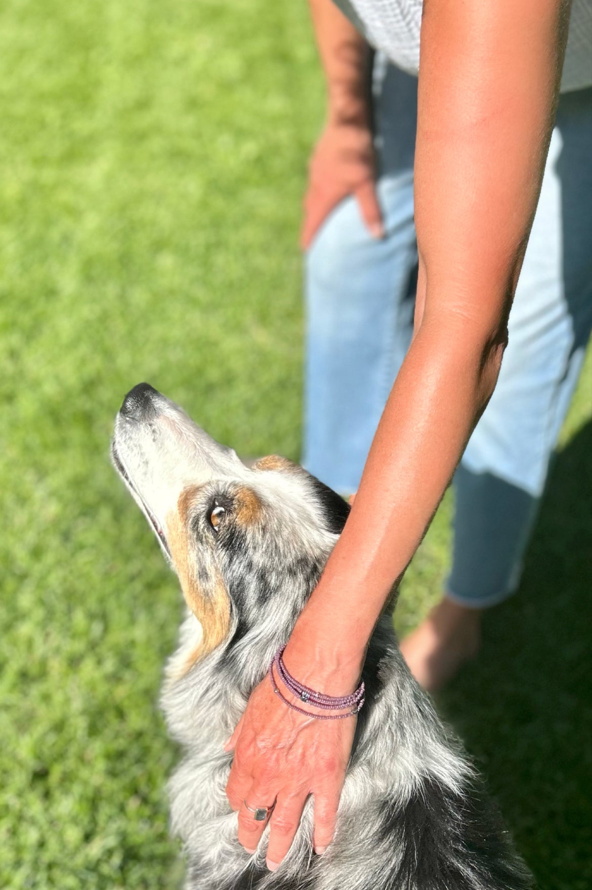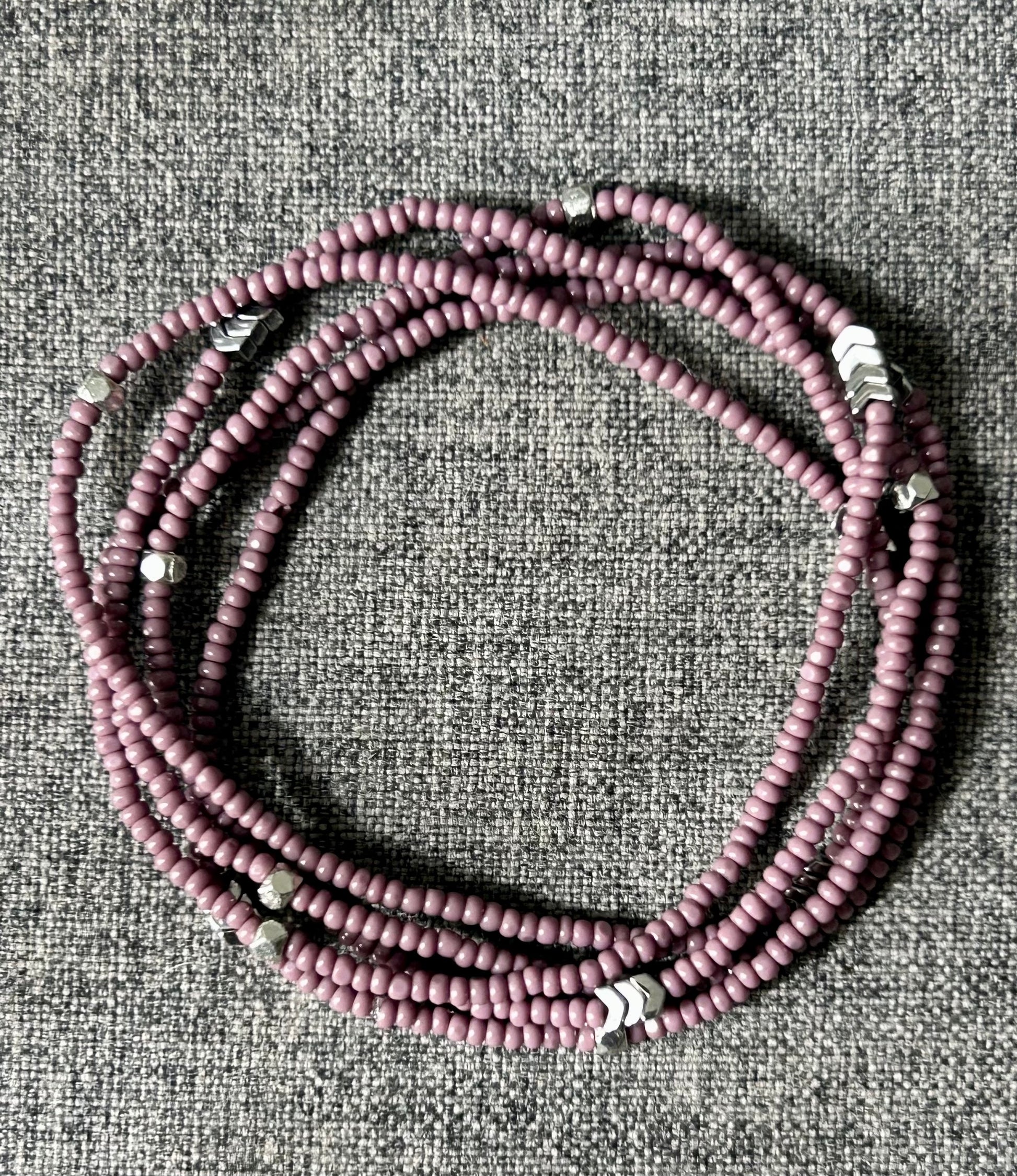 Lilac purple-toned Czech glass seed beads on strong elastic cording, these bracelets wrap around your wrist 5 times and feature silver hematite for a touch of class. Hematite is an iron-rich oxide mineral that's known for its healing and calming properties.