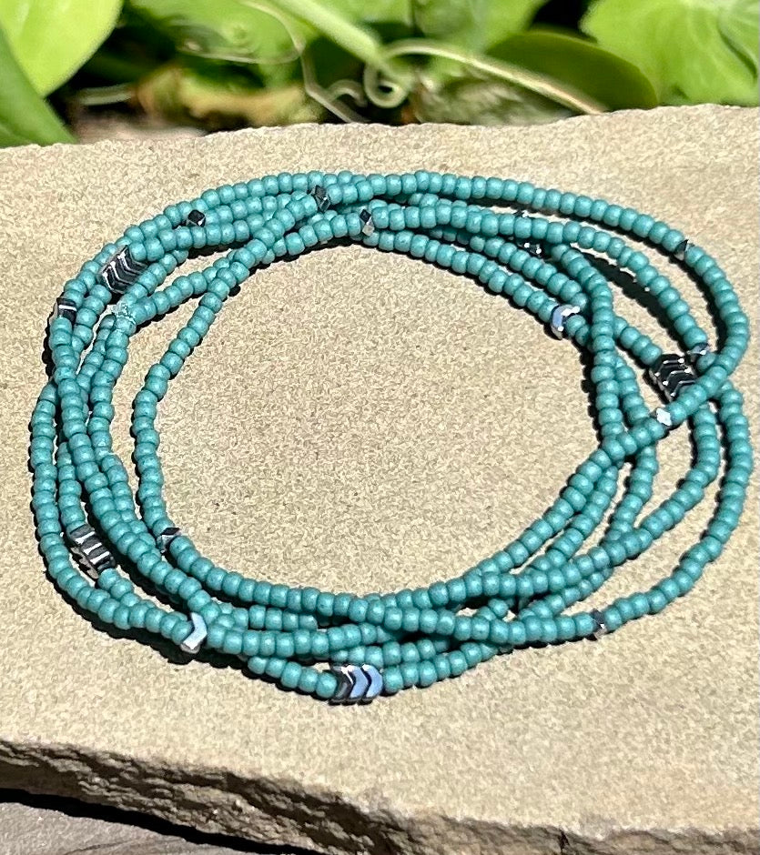 Made with sage green Czech glass seed beads on strong elastic cording, these bracelets wrap around your wrist 5 times with feature silver hematite for a touch of class. Hematite is a semi-precious, iron-rich oxide mineral that's known for its healing and calming properties.