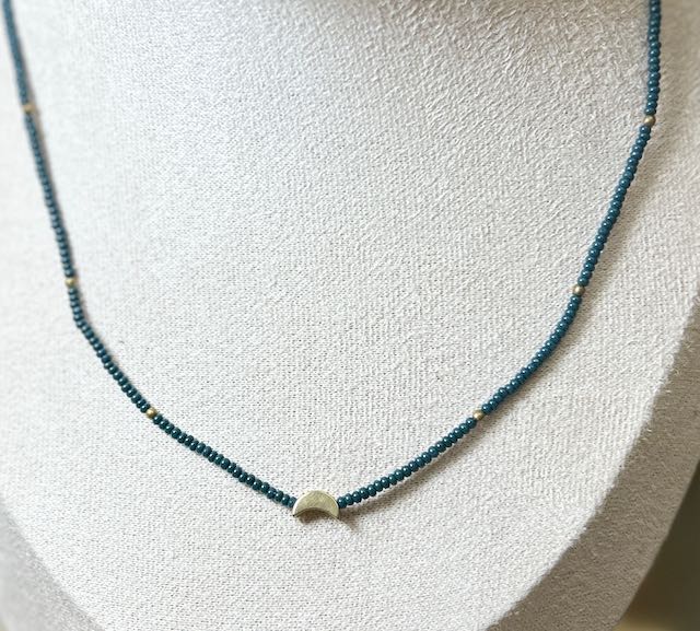 Steel Gray Moon Boho Beaded Necklace with Gold Moon Charm