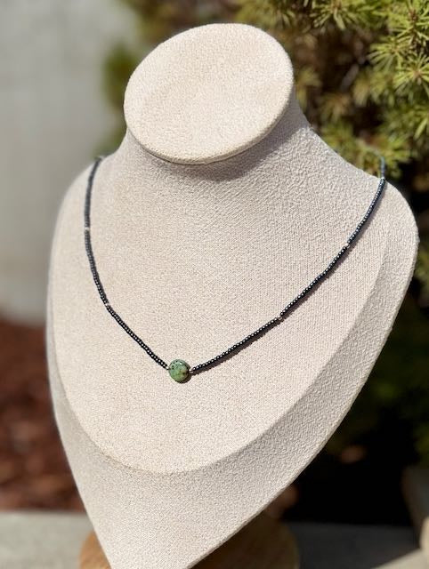 The muted steel gray beads pair beautifully with the earthy, vibrant tones of African Turquoise. Its organic circle pendant reflects subtle natural symbols, adding a touch of calm and sophistication. Lightweight and thoughtfully handmade, this necklace blends delicate boho style with everyday comfort, perfect for wearing alone or stacking with other favorites.