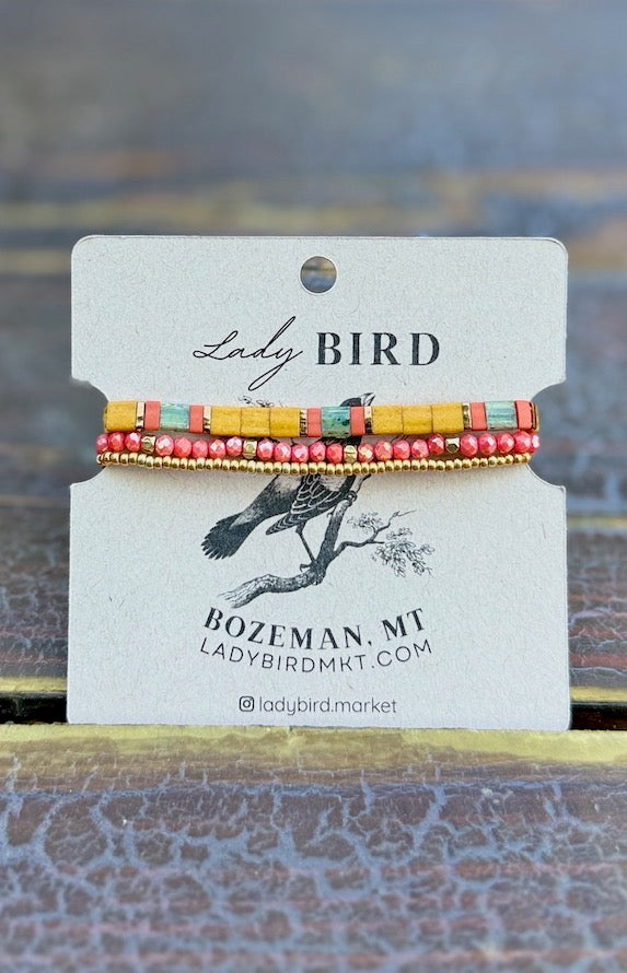 Bring sunshine and earthy vibes to your style with this Sunflower Yellow, orange & Moss Green Tila Bead Bracelet Set. This two-piece stack includes: