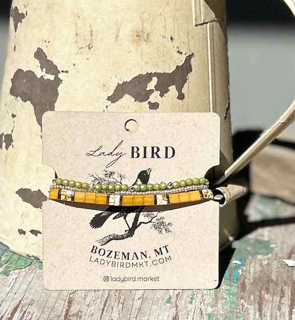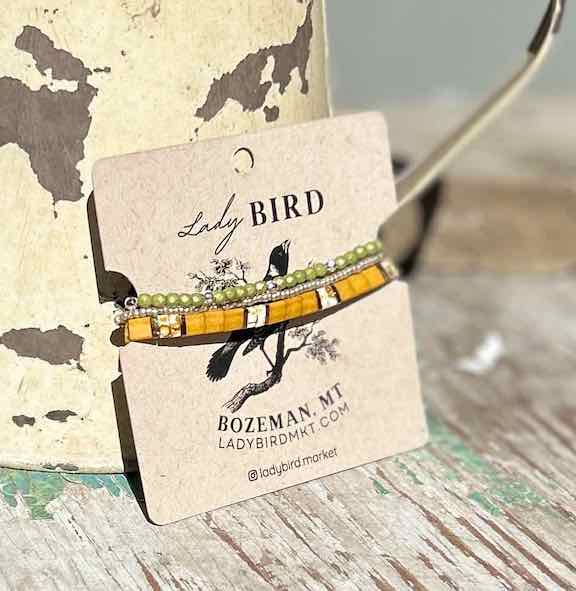 A beautiful shade of yellow is paired with speckled white tila beads and accompanied by a complementary olive-green and silver Czech glass beaded stretchy wrap that goes around your wrist two times. As two separate pieces for a stacked bracelet look, the Tila bracelet and wrap bracelet can be worn on their own, but they're even better together! Or EVEN better, pair them with matching tile-beaded dangle earrings and one of our seed bead wrap bracelets for the win!