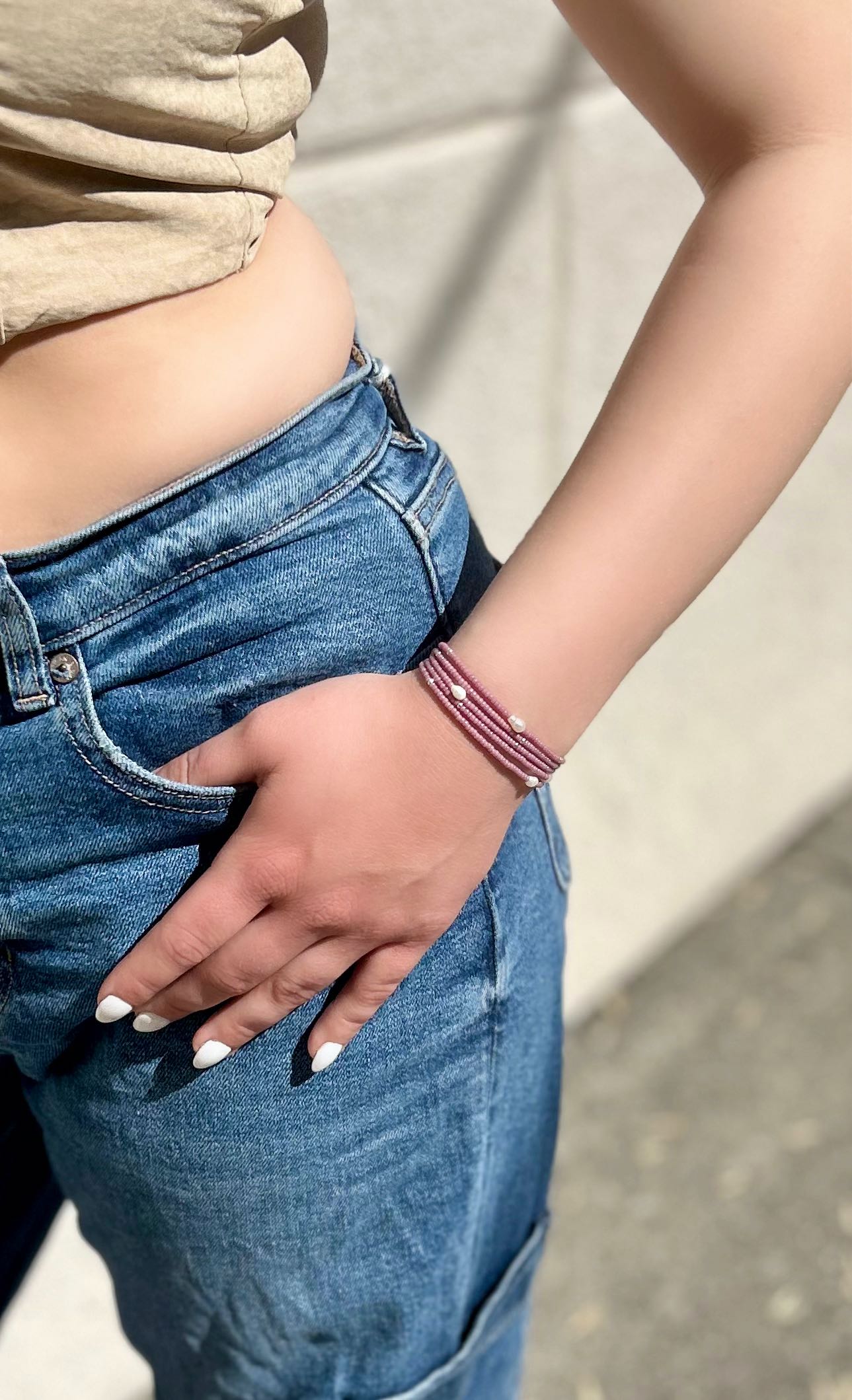 Hand-strung with a mix of delicate tea rose pink Czech glass seed beads and luminous freshwater pearls with sprinkles of gold or silver, this piece is where casual cool meets understated elegance. The smooth, stretchy design lets you slip it on in seconds—no clasps, no hassle—just effortless styling.