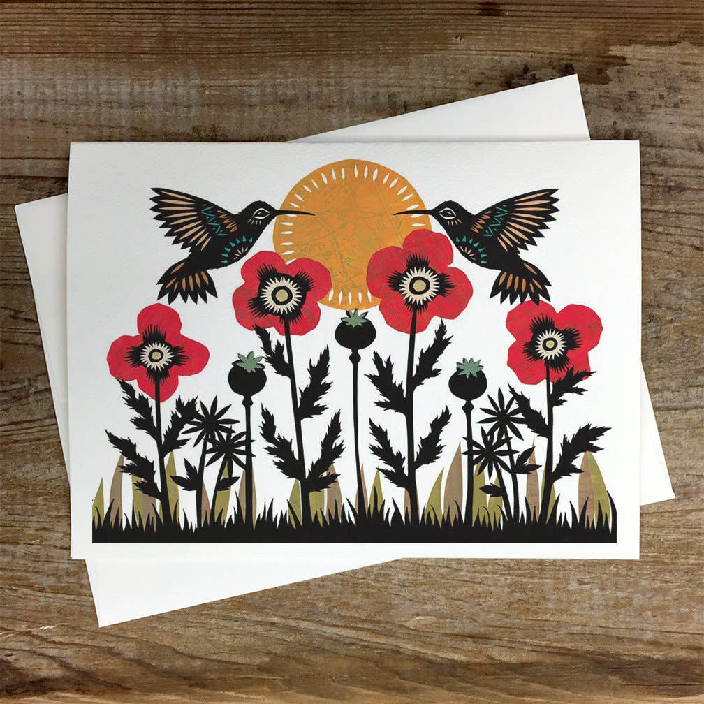 Single greeting card featuring a reproduction of an original hand cut paper collage by Angie Pickman on Palm Beach White Strathmore paper. Blank inside for personalization.