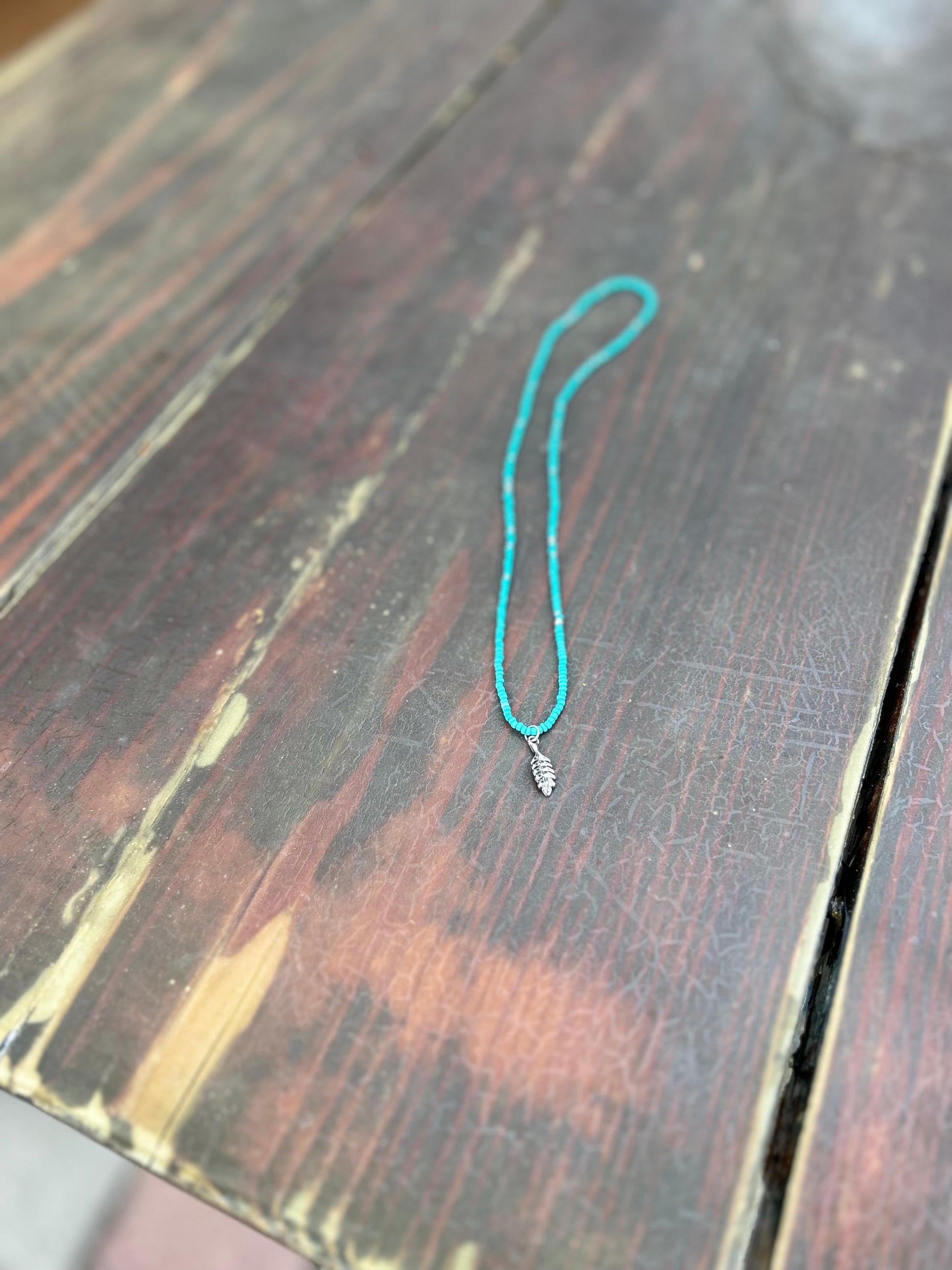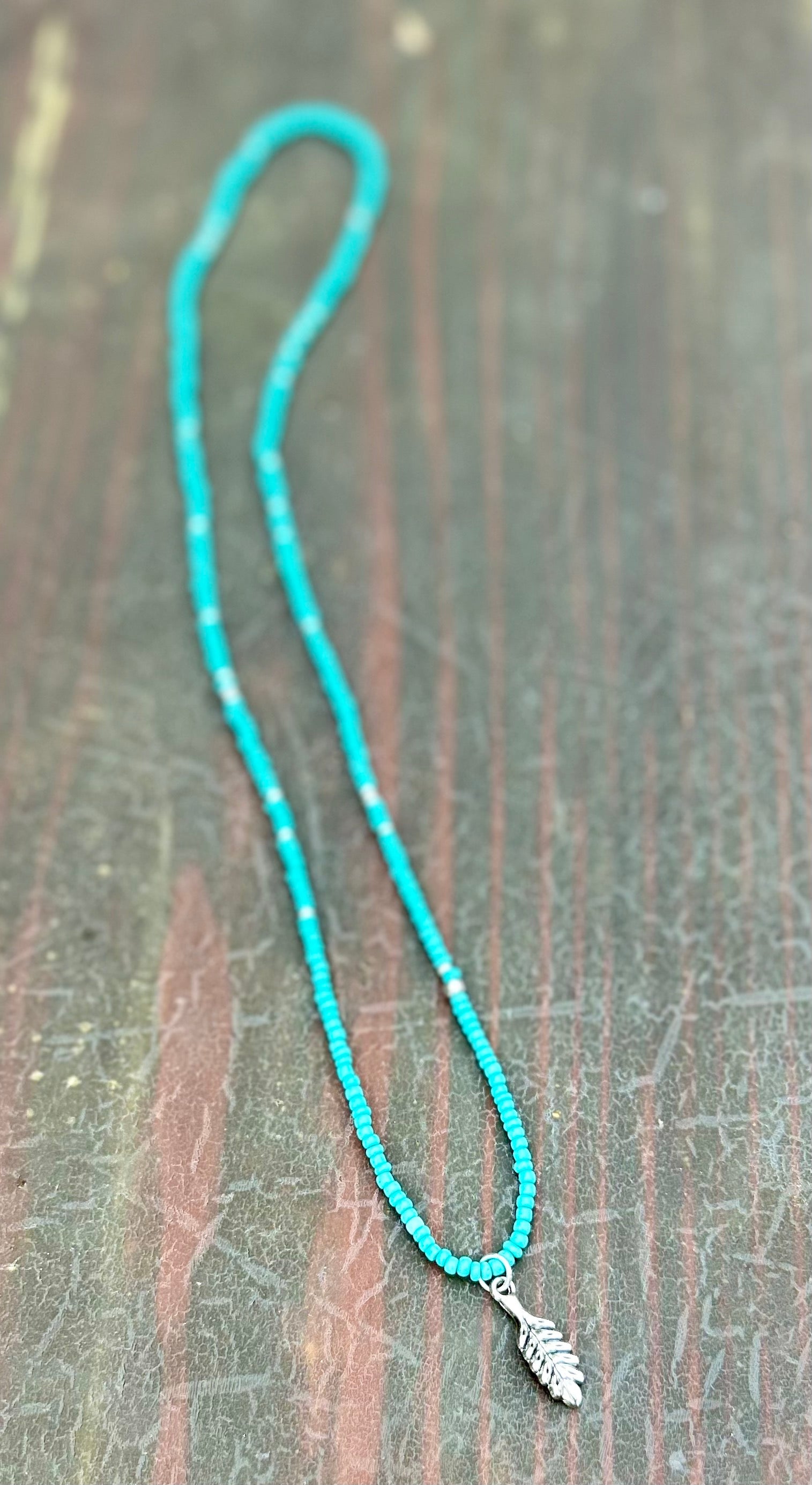 Turquoise Boho Seed Bead Necklace with Silver Leaf