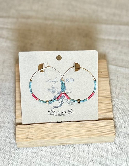 Classic hoop earrings featuring a pattern of delicate speckled turquoise & red Japanese glass seed beads with a metallic gold or silver bead for a decorative centerpiece. These beaded hoop earrings perfectly blend bohemian charm and contemporary style.