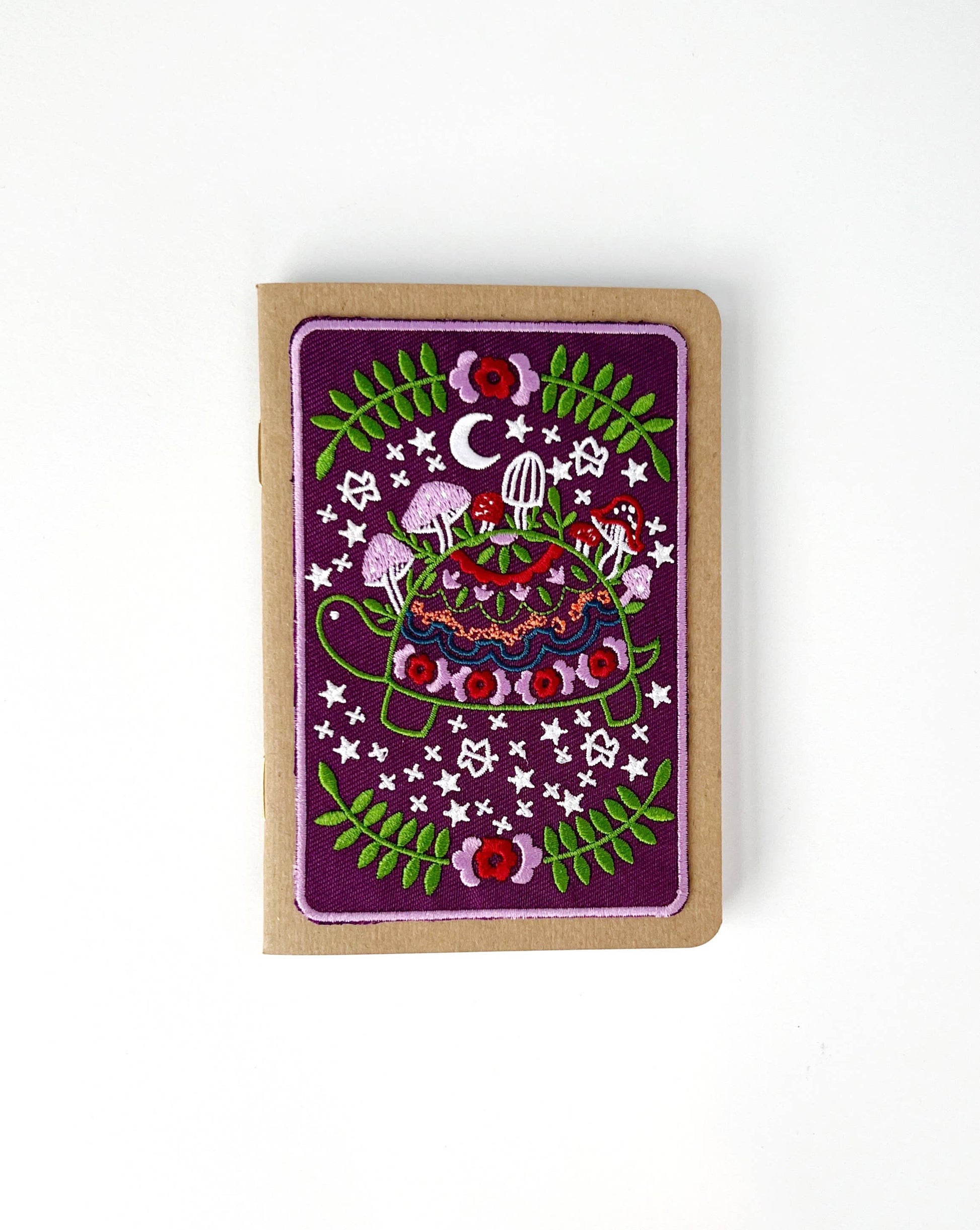 Adorable Forest Turtle Mystical Moon and stars with mushrooms embroidered pocket notebook. Embroidered appliqué on kraft paper 3.5X5 inch 32 page blank sheet journal. Perfect for tucking in your bag or pocket. Blank high quality paper allows you to write or sketch. Rikrack logo stamped on back.