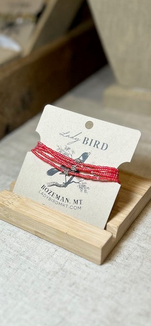 Made with vibrant orangey-red Czech glass seed beads and complementary silver metallic beads, our wrap bracelets are designed to add a touch of bohemian flair to any outfit. Handcrafted with strong elastic cording, these stretchy bracelets effortlessly wrap around your wrist five times or around your neck two times as a choker-style necklace, providing a comfortable, lightweight, durable fit for all-day wear and active outdoor play.