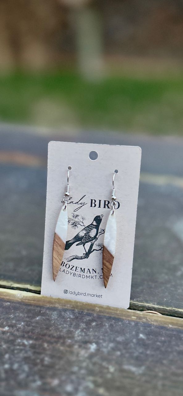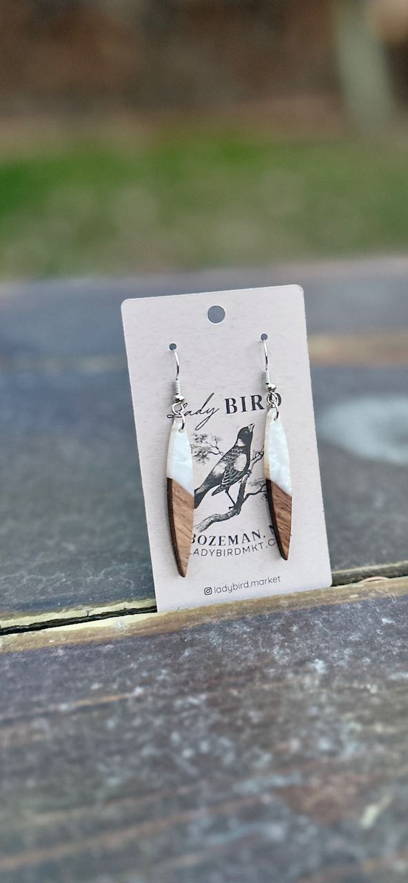 Walnut Wood & Marbled White Resin Pointed Pendant Earrings