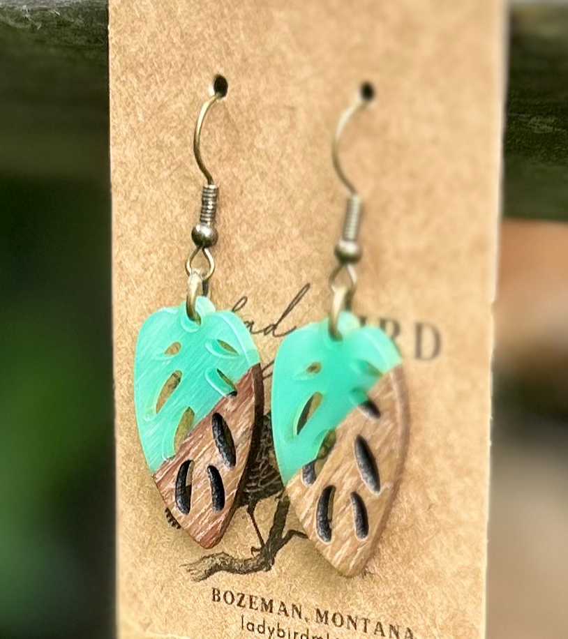 Walnut Wood & Turquoise Resin Leaf Earrings