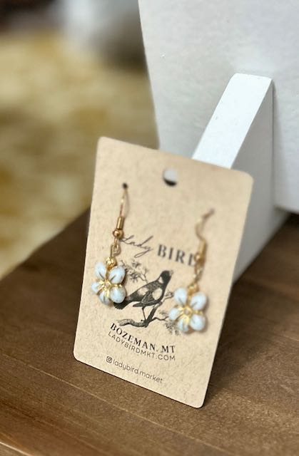White Opal & Gold Etched Glass Wild Violet Flower Dangle Earrings