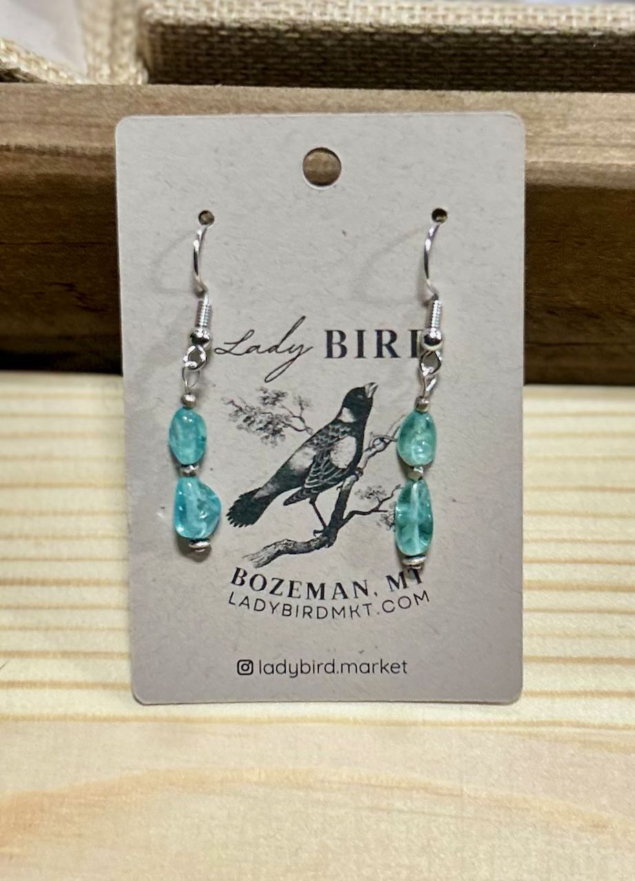 These handmade dangle earrings feature polished, translucent, light blue aquamarine chips with sterling silver beads. Aquamarine is a calming and soothing stone often associated with the water element, and its soft blue hue is said to evoke the tranquility of the ocean. Our gemstone dangle earrings are all about easy, everyday Boho-style. Made with natural gemstone beads, each set comes with either silver or gold accent beads to suit your personal taste. Pair it with one of our stretchy gemstone necklaces for a complementary set. Earring hardware is silver-plated brass and contains no nickel.