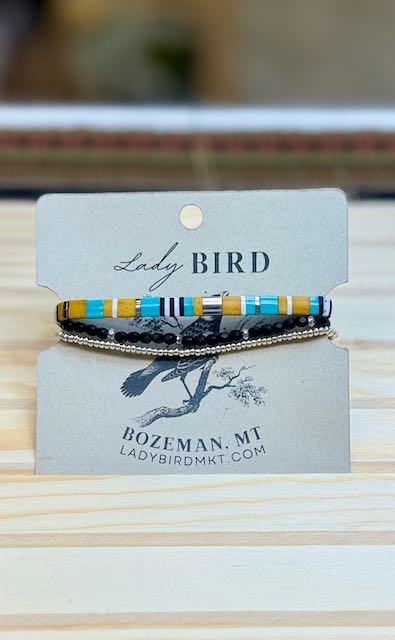 Add bold boho flair to your wrist with our Yellow, Turquoise & Zebra Striped Tila Bead Stretch Bracelet, paired with a sleek black Czech glass two-wrap bracelet for the ultimate layered look. Handmade with Japanese Miyuki Tila beads, this set is vibrant, durable, and effortlessly stylish.